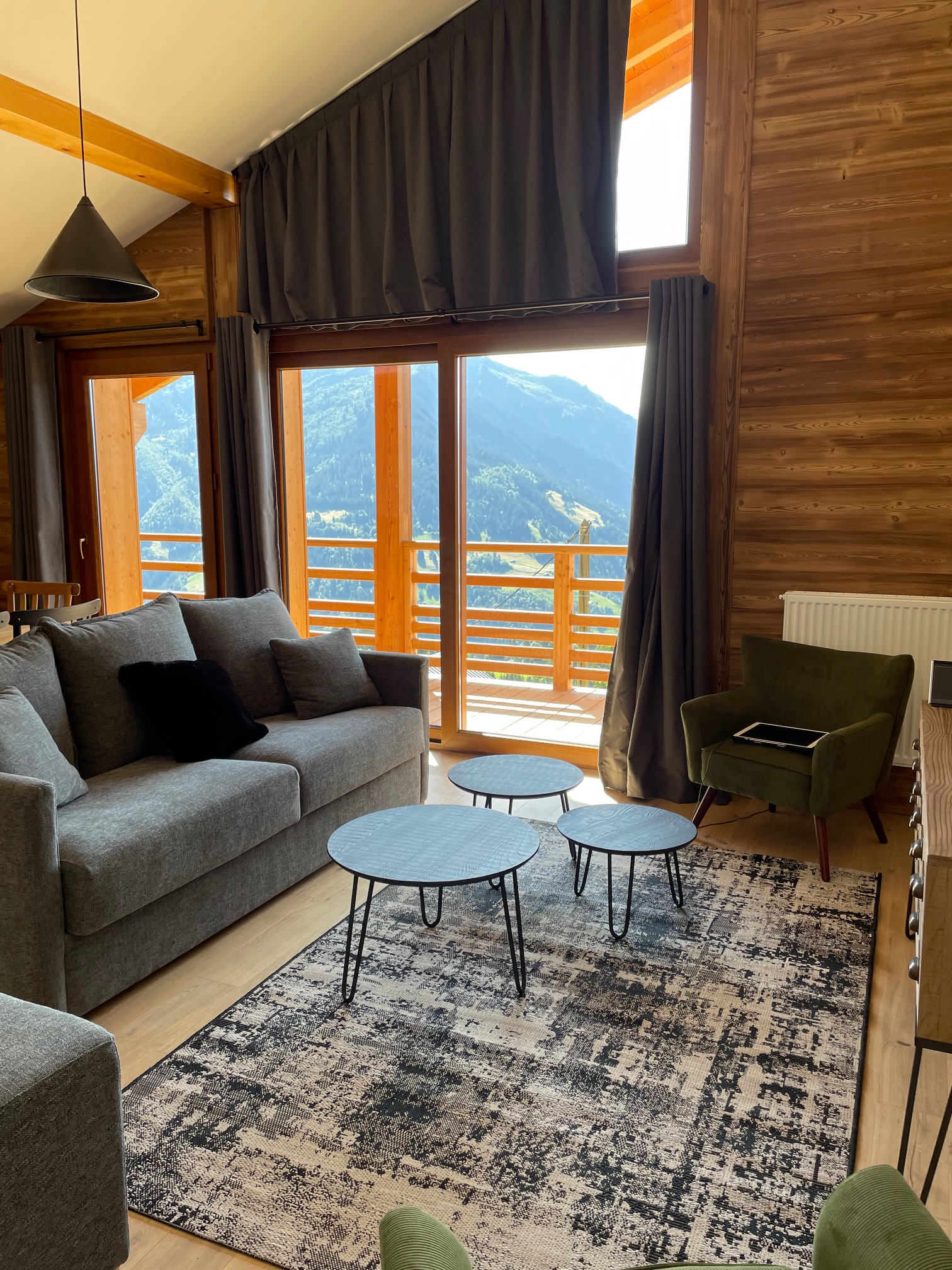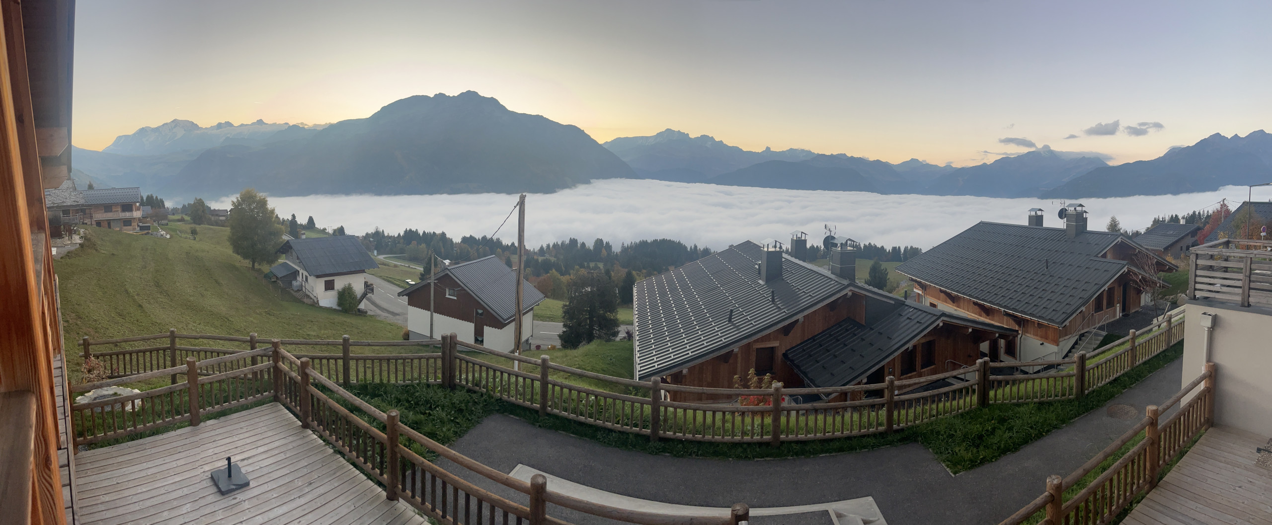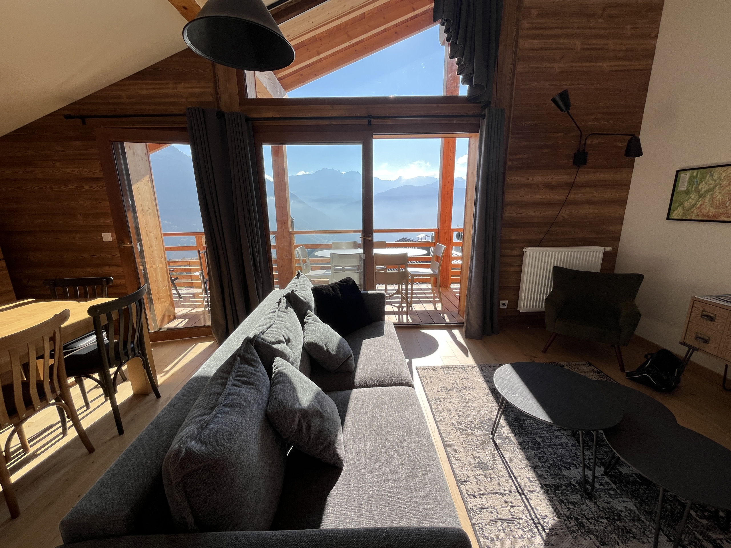 Balcon sud avec espace repas depuis lequel la vue est inoubliable sur le Beaufortain et le massif du Mont Blanc !